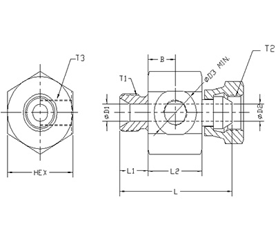 ITEM | P/N | T1 | T2 | T3 | L | L1 | L2 | B | D1 | D2 | D3 MIN. | HEX |